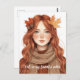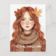 Este cartão apresenta uma jovem mulher personificando o outono, com cabelos vermelhos vibrantes adornados com folhas do outono, envoltos num lenço e suéter aconchegantes. Ele captura a essência confortável e quente da estação, perfeita para aqueles que amam a vibração acolhedora e autóctone. Ideal para qualquer amante do outono, especialmente aqueles que gostam de abraçar a "estética do outono" ou "vibes do outono", este cartão é excelente de enviar saudações sazonais, obrigado, notas, ou apenas uma mensagem atenciosa para um colega "entusiasta do outono".