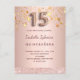 Um convite moderno, na moda e glamouroso para uma Quinceañera, festa de aniversário 15. Um fundo metálico rosa dourado falso com estrelas douradas falso. O nome é escrito com um moderno e escuro, rosa dourado, escrito com letra de estilo manuscrito. Personalize e adicione os detalhes da sua festa. O número 15 é escrito com uma fonte de estilo balão, script. Fundo: rosa dourado, design postal. Dica: Se você não quiser que pareça um cartão postal, clique em personalizar, vá para o verso e remova o divisor e o carimbo de posto.