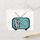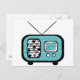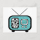 Rádio que lembra os anos 50, mas com padrões selvagens. Turquesa, branco e preto. Antena em cima.