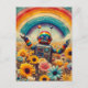 Um adorável robô arco-íris num campo de flores com arco-íris em um estilo retro mestiço