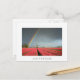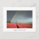 Cartão postal de um arco-íris colorido num céu escuro sobre um moinho de vento e um cheio de campo de tulipas vermelhas brilhantes durante uma tempestade primavera num cenário próximo de Amesterdã, nos Países Baixos, com uma fronteira branca, e o texto: "Amesterdã".