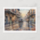 A street in New Orleans is bathed in the warm glow of streetlights as rain creates reflections on the pavement. A horse-drawn carriage moves slowly along the cobblestone street.