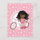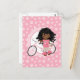 Esta design apresenta uma garota africana americana fofa com sua bicicleta rosa. Em fundo de sotaque giro rosa e branco.
