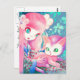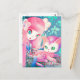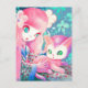 Cartão Postal Rapariga com cabelo rosa em Kimono com gato Kawaii
