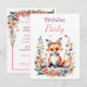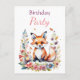 Uma doce pequena raposa bebê cercada por flores rosa e azul ilustração aquarela convites de festa de aniversário de menina.