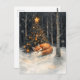 Cartaz com uma adorável raposa dormindo em frente a uma árvore de Natal na floresta.