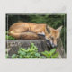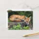 Uma raposa vermelha usa um velho toco de árvore como um lugar para descansar na borda da floresta.