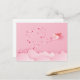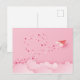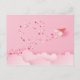 Avião de papel recortado com corações no jato de ar em um céu rosa com nuvens rosadas.