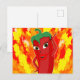 Um personagem de desenho animado de pimenta vermelho e quente. Design original. O fogo atira ao fundo. Cartões postais personalizados. Ideia de decoração para amantes de comidas picantes.
