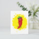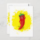 Um personagem de desenho animado de pimenta vermelho e quente. Design original com fundo de tela de tinta amarela. Cartões postais personalizados. Ideia do presente.