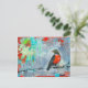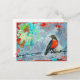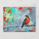 A imagem é de uma pintura original de um pinto vermelho sentado sobre um fio olhando sobre o ombro de um velho cartão postal manuscrito.