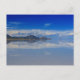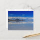 Planícies salinas de Uyuni na Bolívia com linha do horizonte e montanha refletidas em planícies cobertas de água.
