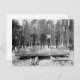 Este cartão-postal apresenta uma fotografia antiga de vários madeireiros antiquados, ásperos e desajeitados, que se encontram num grande tronco gigante.