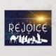 A citação inspiradora REJOICE Cartão de Natal retrata uma estrela brilhante no céu noturno com uma simples cena de natividade branca. As costas mostram a Bíblia Verse John 3:16, "Por Deus tanto amou o mundo que ele deu ao seu único filho, que quem acredita nele não deve morrer, mas ter vida eterna."