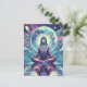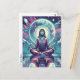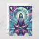 Cartão postal de meditação. Uma bela e serena ilustração aérea relaxante de uma cena azul e roxa com uma mulher medicando em frente à lua, planetas, estrelas e galáxia para lhe dar uma vibração pacífica. Bonito para uma sala de meditação ou um estúdio de yoga.