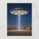 Un vaisseau spatial en forme de soucoupe volante planant au-dessus d'une installation militaire clôturée qui est supposée être la zone 51 ou area 51. Un puissant rayon lumineux descend du centre de l'OVNI vers l'entrée d'une zone restreinte, éclairant la nuit étoilée et l'espace désertique environnant.