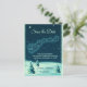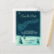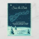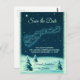 Um cartão postal de Natal para salvar a data com uma ilustração vintage de Papai Noel em seu trenó sendo puxado por suas renques. Pequenas estrelas esvoaçam no céu noturno. Árvores de pinheiro cobertas de neve no chão. Estilo retrô vintage.