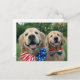 Feliz 4 de julho, EUA! Mostre o seu espírito patriótico com este cartão de posto do recuperador de ouros fofo! Design apresenta uma fotografia de dois cães celebrando o Dia da Independência com gravatas de arco vermelho, branco e azul.