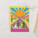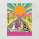 Postcard in an illustration of five stylishly dressed cats wearing sunglasses ride in a pink convertible through a vibrant desert landscape. The backdrop features cacti, mountains, and a radiant, setting sun. The whimsical, pop-art style evokes a playful, retro road trip vibe.