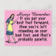 A citação original, engraçada e desmotivadora/falsa inspiracional neste cartão postal diz, "Sempre lembre-se: Se você coloca seu melhor pé para frente, então você fica parado no seu pé ruim, e isso provavelmente é doloroso." Tem um retrô de 40 ou 50 de uma mulher segurando um ponteiro de um professor e vestindo um avental, segurando um pé enquanto ela se coloca no outro. O fundo é rosa com bolinhas brancas-rosadas esmaecidas. Este é um ditado humorístico para quem gosta de sarcasmo e também seria bom para um podiatra.