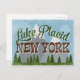 O lago Plácido, Nova Iorque, neo viagens vintage em diversão com estilo de desenho retro com montanhas com capas de neve, florestas e árvores abaixo, céus azuis e texto legal com script retro.
