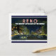 Vintage com a ilustração de Reno à noite. Luzes coloridas e carros velhos com uma fonte néon rosa "Reno" no topo com "A maior pequena cidade do mundo" em branco abaixo. É uma cena da Virginia Street em Reno.