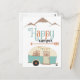 A arte digital em branco apresenta texto "Camper Feliz", seta estilo Boho, silhueta de montanha e trailer viagem RV estilo retrô