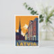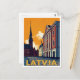 Celebrate the historic charm of Riga, Latvia, with this vibrant retro travel postcard. The design showcases the cobblestone streets of the Old Town, featuring classic architecture like the striking red and white House of the Blackheads and a soaring church spire against a bold orange sky. This artwork captures the unique atmosphere of the Baltic capitals, making it a fantastic piece for collectors of stylized European cityscapes.