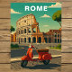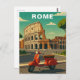 Embrace the Dolce Vita with this charming Rome Travel Card. This vintage-style illustration features the legendary Colosseum, the grandest amphitheater of the Roman Empire, paired with an iconic red Vespa scooter parked on a sun-drenched cobblestone street.