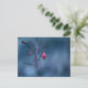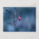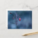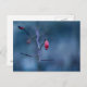 Cartão-postal com uma foto em close-up de uma fruta de rosa vermelha congelada antiga, em um fundo azul de um livro. Personalizável.
