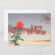 Uma rosa rosa única em um caule verde folhoso é segurada contra um céu de pôr do sol. Céu dourado na parte inferior e céu azul-acinzentado na parte superior. Nuvens rosa e cinza estão espalhadas pelo céu. "Feliz Aniversário" está em texto rosa com uma sombra preta (pode ser editado para o seu sentimento).