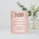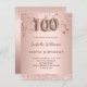 Um convite moderno, na moda e glamouroso para uma 100ª festa de aniversário. Um fundo metálico rosa dourado falso com rosa dourado e estrelas pias-gotas e banda brilhante. O nome é escrito com um moderno e escuro, rosa dourado, escrito com letra de estilo manuscrito. Personalize e adicione os detalhes da sua festa. O número 100 é escrito com uma fonte de estilo de balão, script. Fundo: rosa dourado, design postal. Dica: Se você não quiser que pareça um cartão postal, clique em personalizar, vá para o verso e remova o divisor e o carimbo de posto.