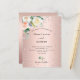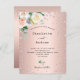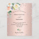 Um convite de casamento glamouroso. Um fundo de aparência metálica falsa rosa dourado. Decorados com diamantes falsos cor-de-rosa e flores impermeáveis, flores em ouro branco e rosa com verde. Personalize e adicione seus nomes e detalhes do casamento. Texto preto. Fundo: fundo rosa dourado e diamantes, design postal. Dica: Se você não quiser que pareça um cartão postal, clique em personalizar, vá para o verso e remova o divisor e o carimbo de posto.
