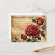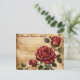 Um cartão de agradecimento absolutamente deslumbrante com rosas vermelhas colocadas em papel pergaminho antigo com texto desbotado. Romântico, um pouco gótico, como algo saído de um conto de fadas.