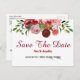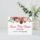 Um cartão postal de lançamento elegante, mas rústico, "Salvar a data". A ilustração tem rosas vermelhas cor-de-rosa e arrojadas com verde. O reverso tem gráficos de casamento correspondentes. A caligrafia pode ser personalizada com sua escolha de palavras, fonte e formatação.