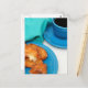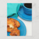 Rosquinha de leitelho com uma xícara de café preto servido em prato colorido turquesa, xícara e guardanapo