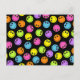 Rostos laranja, cor-de-rosa, roxo, verde, azul e amarelo num cobrir de fundo preto neste design.