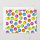 Rostos laranja, rosa, roxo, verde, azul e amarelo em um fundo branco cobrem este design.
