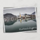 Cartão postal de uma cena de inverno com o reflexo da torre amarela da igreja na água do lago Tegernsee e com neve nos telhados das casas da cidade de Rottach-Egern com as montanhas dos Alpes no fundo da Baviera (Bayern), Alemanha com borda branca e o texto "Rottach-Egern". A placa está um pouco girada para criar a ilusão de ela se soltar.
