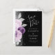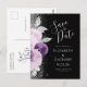 Este elegante cartão moderno de salvar a data apresenta um design floral roxo e lavanda aparado com brilho prateado falso. O texto personalizável combina caligrafia manuscrita e fonte copperplate em cinza prateado sobre um fundo preto. O lado reverso repete as informações, juntamente com um endereço de retorno personalizável.