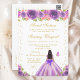 Este convite de aniversário de sweet sixteen elegante e glamoroso apresenta uma bela princesa com cabelos escuros e pele morena em um vestido de baile roxo. O texto combina caligrafia manuscrita e fontes modernas sem serifa para um visual sofisticado e de classe. Os arranjos florais, borboletas e confetes dourados criam a combinação perfeita de rústico e chique.