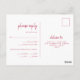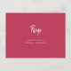 Estes cartões postais elegantes e minimalistas de resposta ao casamento apresentam a tipografia moderna do roteiro e texto limpo, sans serif para um simples e na moda magenta, vermelho e branco design que você vai adorar. Há espaço para adicionar suas opções de hóspedes para a escolha da refeição ou a escolha jante. O texto é mantido longe das bordas superior e inferior da parte traseira do cartão postal, para diminuir a chance de ser coberto no topo e na parte inferior por marcas postais.