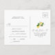 Este cartão postal RSVP, cardápio de limão moderno, é perfeito para um casamento de primavera ou verão. O design mediterrânico rústico apresenta limões aquosos brilhantes e bonitos com flores brancas boêmicas e folhas verdes elegantes. Este cartão postal de resposta do casamento pergunta aos convidados qual refeição eles gostariam na sua recepção.