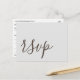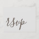 Este design de cartão postal RSVP glamouroso e respeitável apresenta a mensagem "rsvp" na frente. Ele também apresenta um formulário de RSVP personalizável no verso, juntamente com um endereço personalizável ao qual as placas de RSVP completadas seriam enviadas. Cartões RSVP como este talvez pudessem ser usados para descobrir quem estará participando de uma festa de aniversário, de uma festa de formatura, de uma recepção de casamento ou de alguma outra celebração.