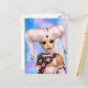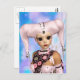Um cartão-postal adorável com uma personagem bonito de fantasia de harlequin, vestida com a fantasia de um palhaço, mas parecendo muito triste.