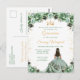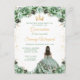Este convite de aniversário de Quinceañera elegante e glamoroso apresenta uma bela princesa com cabelos escuros em um vestido de baile verde sage. O texto combina caligrafia manuscrita e fontes modernas sem serifa para um visual sofisticado e elegante. Os arranjos florais e confetes dourados criam a combinação perfeita de rústico e chique.