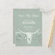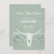 Este cartão postal de convite de casamento com data de salvamento rústico apresenta um crânio de touro ocidental em verde sage pastel branco com textura country vintage antiga desgastida e design de estilo cowboy. Use um pouco de humor com este convite inspirado em fazenda engraçado e fofo. Velho oeste selvagem, animal de fazenda único, legal, moderno. Personalize a escrita e a tipografia. Direitos autorais da imagem Marg Seregelyi Photography.