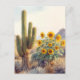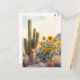 Este design de cartão-postal mistura maravilhosamente o deserto e o encanto floral, apresentando um cacto alto de saguaro ao lado de um vibrante aglomerado de girassóis ouros. Com montanhas ao fundo e luz quente do deserto iluminando a cena, o trabalho de arte capta a harmonia única do sudoeste americano. Perfeito para amantes da natureza, colecionadores de arte do deserto, e qualquer um que goste de beleza botânica, este cartão postal faz uma maravilhosa manutenção ou uma maneira ponderada de enviar uma nota pessoal. Sua mistura de deserto robusto e girassóis cheios de alegria cria um design distinto e atraente.