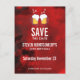 Um cartão postal de salvar a data de aniversário com um padrão abstrato moderno. Cores vermelhas e pretas giram, se misturam e se entrelaçam. Criativo, artístico e único com um toque sombrio e misterioso. Um par de copos de cerveja espumosos tilintam juntos em celebração.