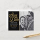 Não tradicional Guardar nosso cartão postal de casamento de data tem um roteiro de ouro moderno contra um fundo preto. Sua foto em preto e branco é elogiada por este anúncio ousado.